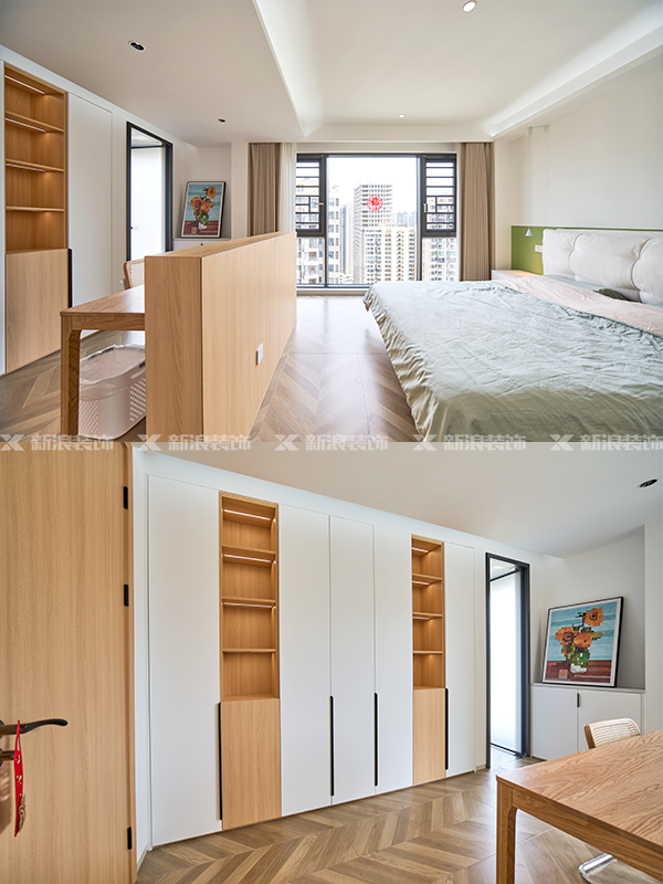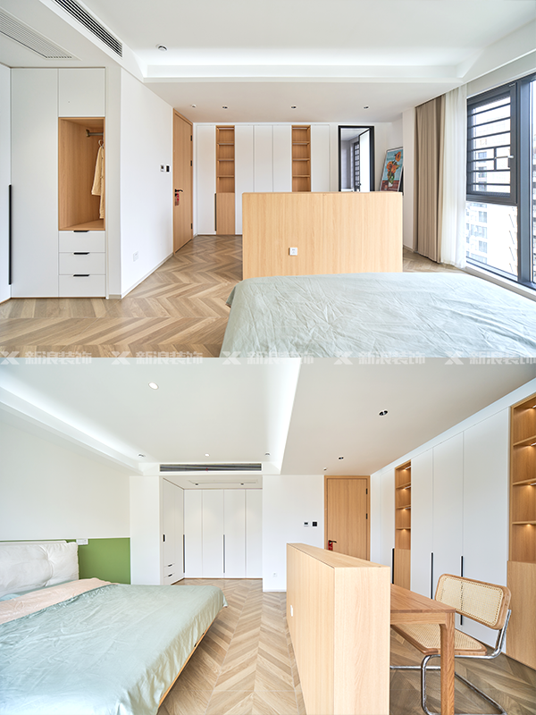 今天這個(gè)臥室做了充足收納的步入式衣帽間+半墻隔斷梳妝臺(tái)+書(shū)柜展示