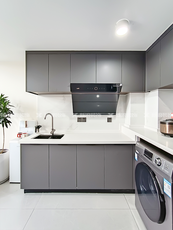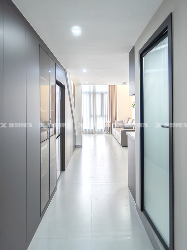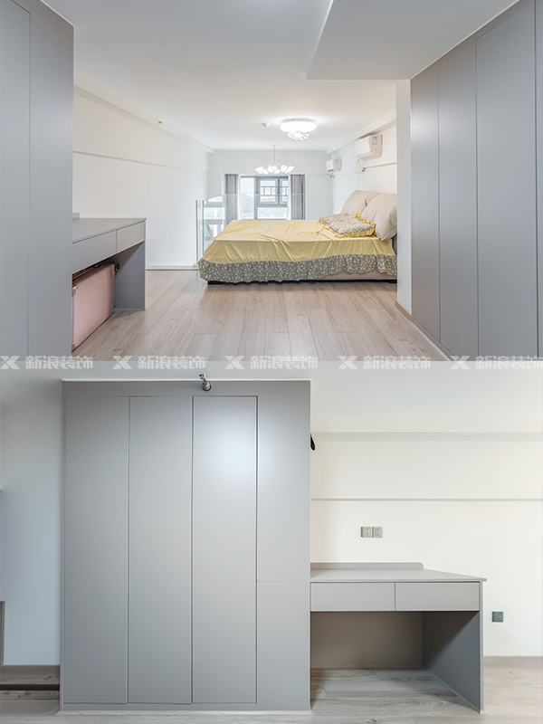 柜子做的高端定制膚感深灰色,反彈器開合,整體更統一。衣物和家居收納完全不用愁~