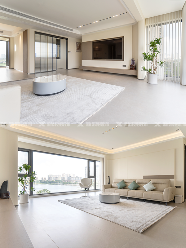客廳吊頂做氛圍燈帶+無主燈筒燈的組合,打造柔和的空間感。