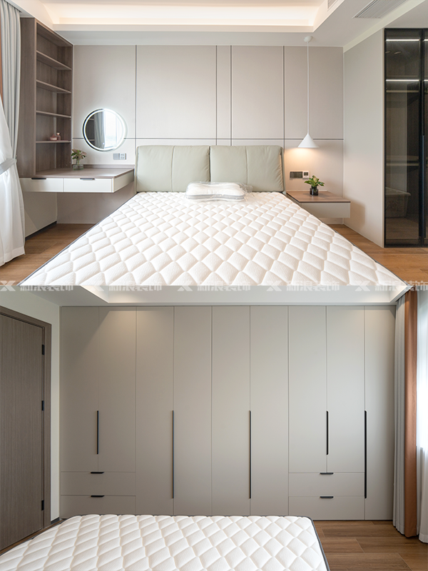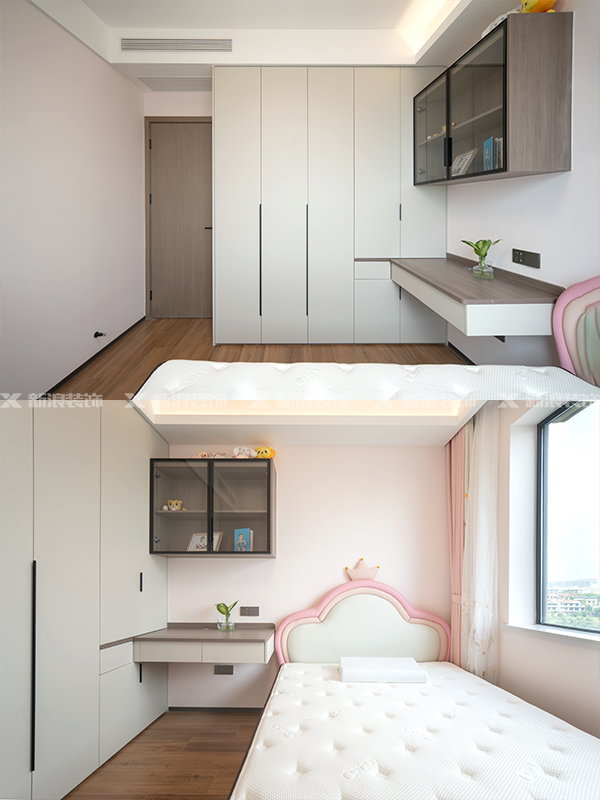主臥+兩個小孩房都做了一門到頂滿墻衣柜,還有梳妝臺和書桌,部分定制搭配玻璃柜門做點綴,更靈動和美觀。