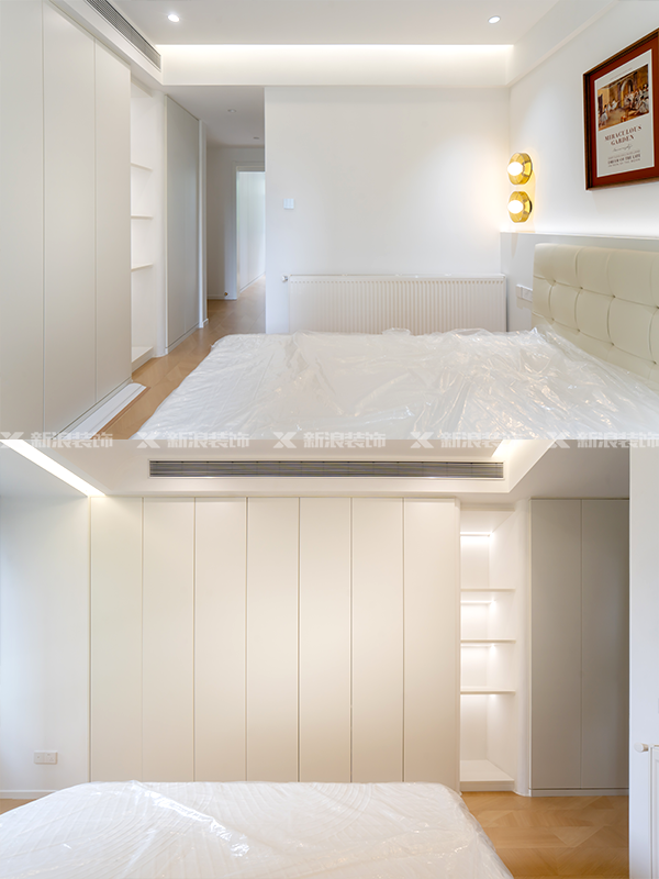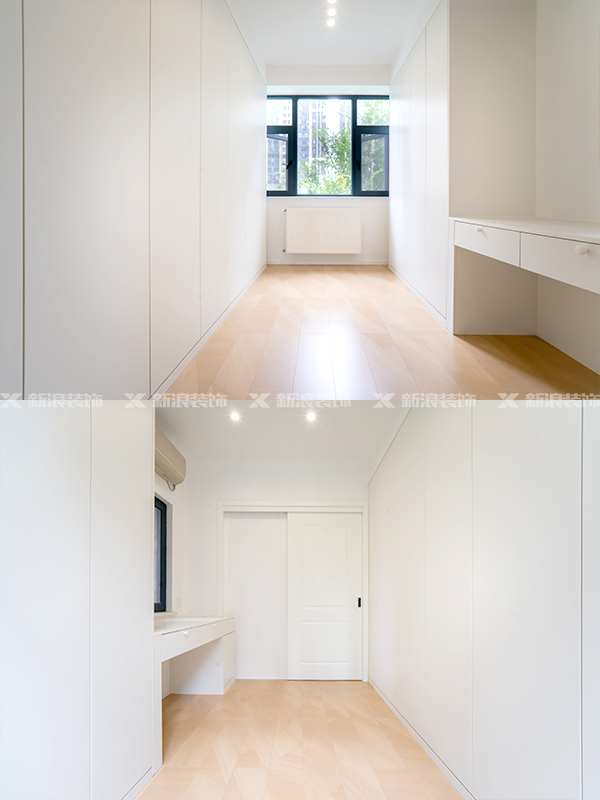 全屋定制衣柜和滿墻柜,統(tǒng)一色調(diào),木紋和暖白搭配更溫馨。