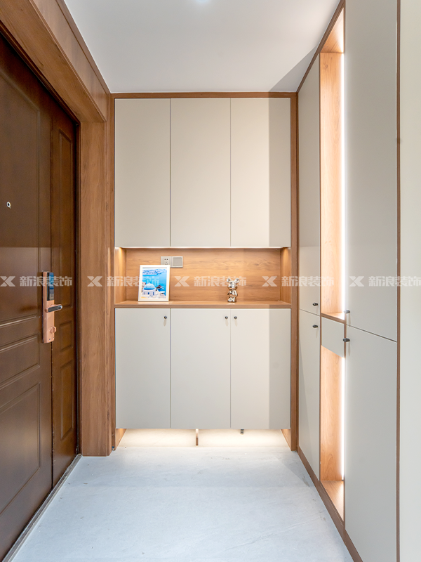 玄關做轉墻設計,胡桃木柜體搭配象牙灰柜門,美觀又好收納!
