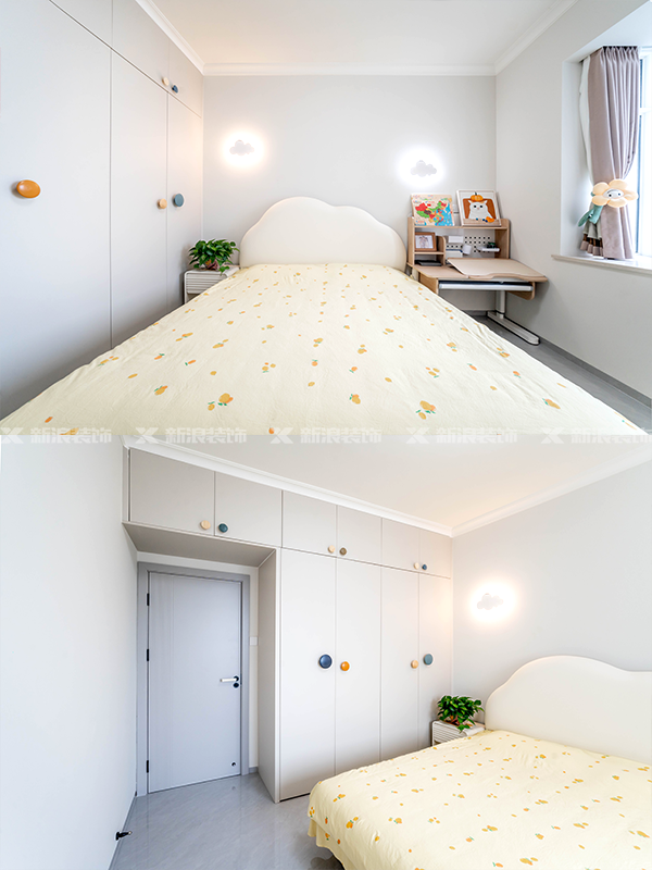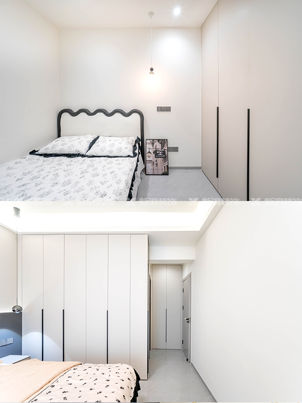 主臥做滿墻一門到頂衣柜,搭配同色床頭背景,溫馨又有整體感。