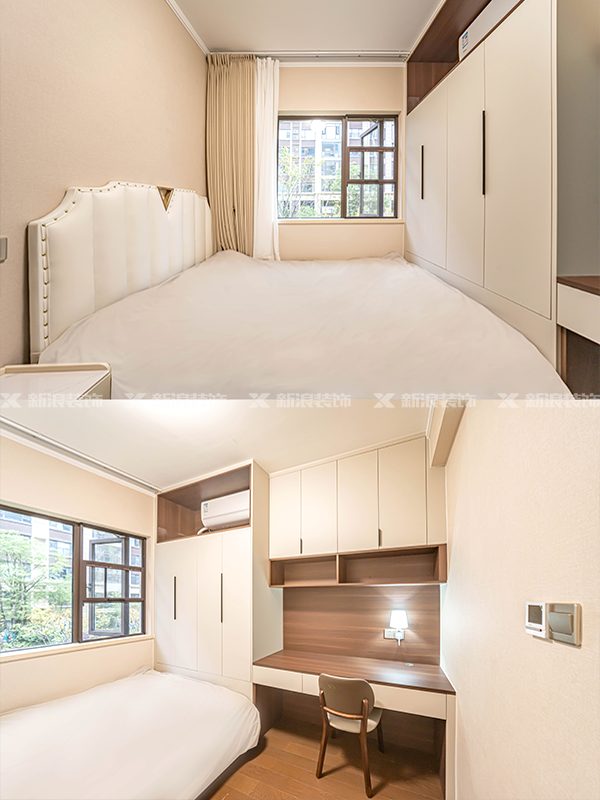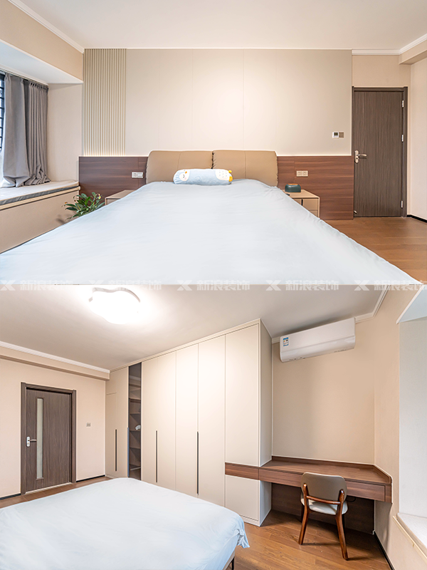 主臥整墻衣柜,穿插梳妝臺,一年四季衣物收納不用愁。