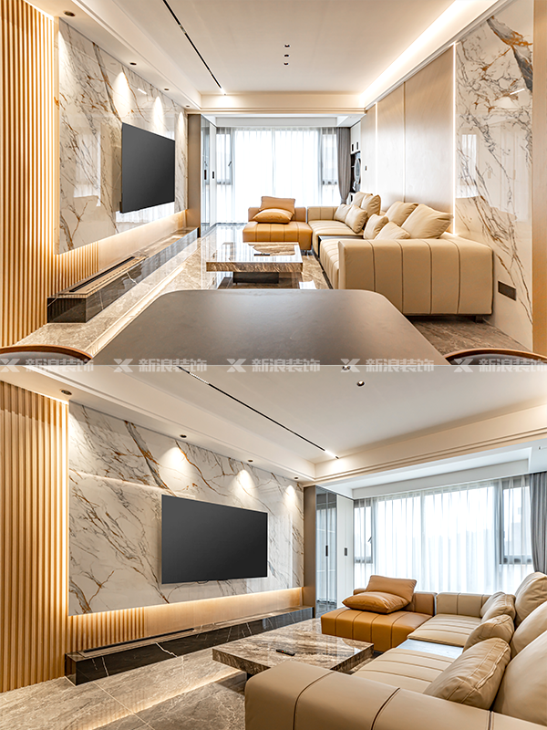 公共區域采用無主燈設計,用射燈、線形燈等氛圍燈光搭配巖板電視背景、沙發背景,