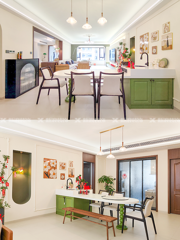 餐廳是白綠撞色的定制餐島臺,帶上下歲臺盆和移動插座,實用美觀