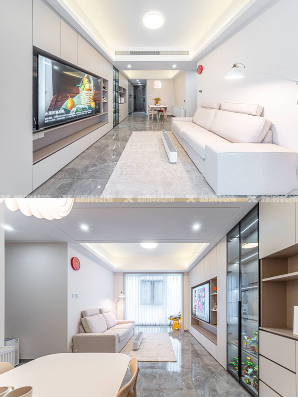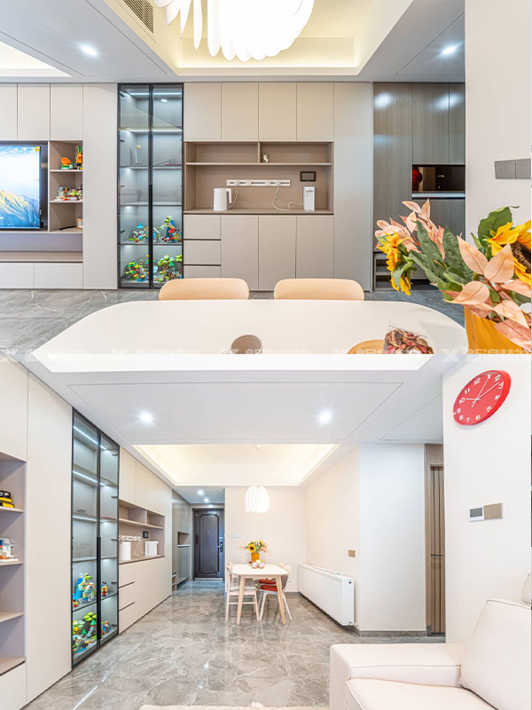 客餐廳和入戶空間直接結合戶型特點做滿墻的定制收納,鞋柜、餐邊柜、電視柜都在一個平面,簡潔利落,且讓空間得到最大化利用。