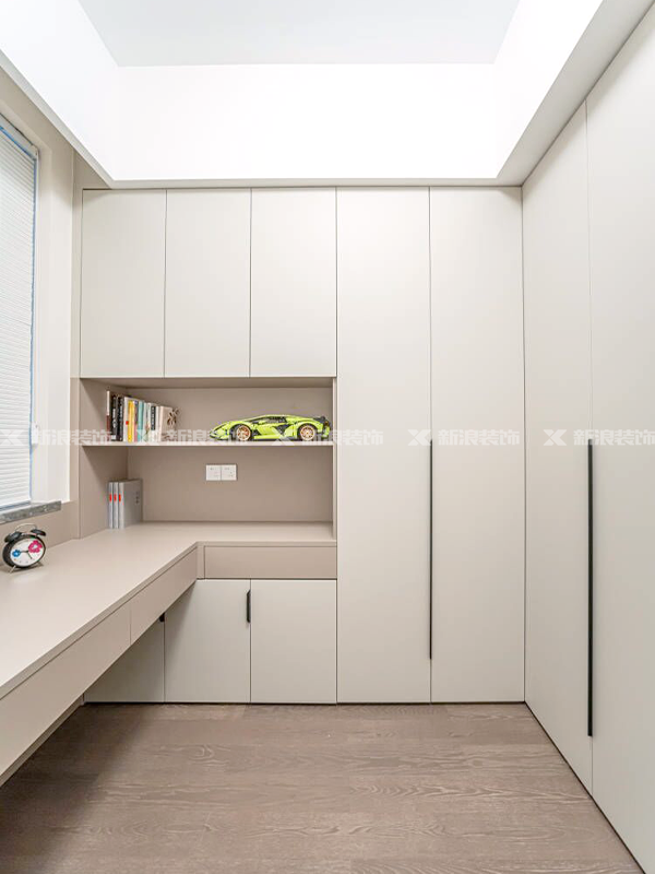 兒童房做轉角書柜、書桌衣柜一體,外加單獨的書房一字長條書桌+收納柜,其他房間也利用充分!