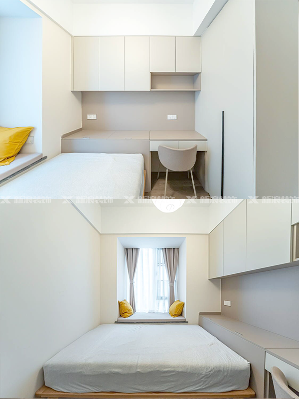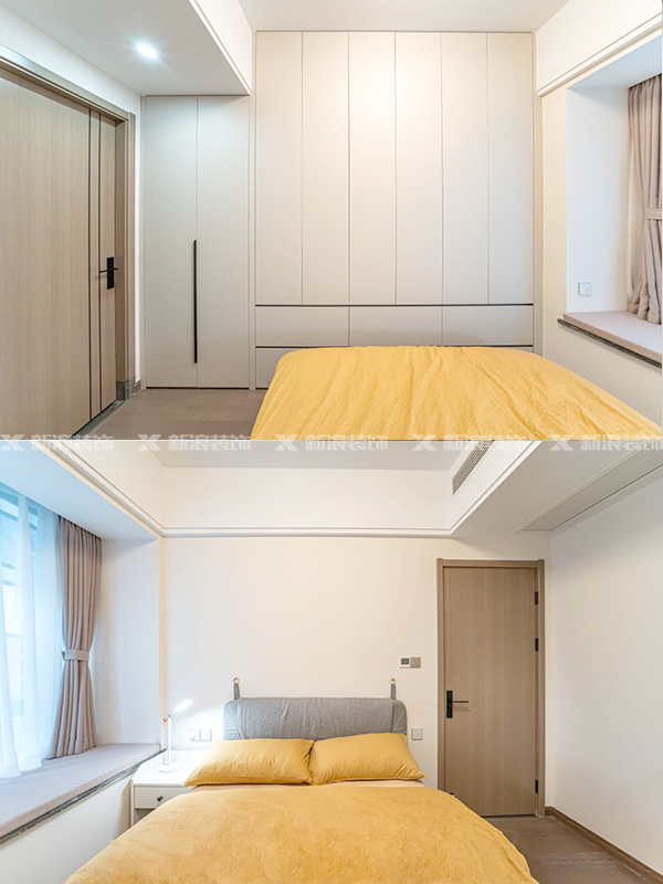 臥室衣柜做床尾空間,分段+無拉手結構設計,下方做抽屜收納小衣物,上方主要做掛衣區和被褥區