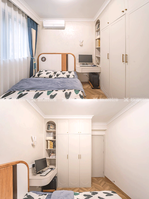 全房定制柜采用同色、同造型,搭配金屬簡約拉手,法式浪漫細節滿滿!根據需求做分隔或者一門到頂搭配,實用又美觀。