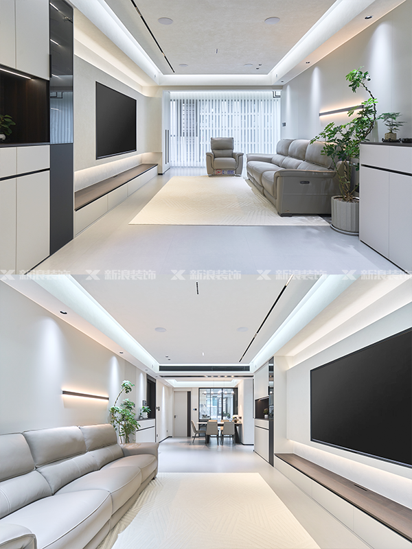 客餐廳簡約吊頂,搭配筒燈、燈帶,空間開闊不壓抑。電視背景墻弧形連接陽臺側墻,柔美空間,且更有整體性。