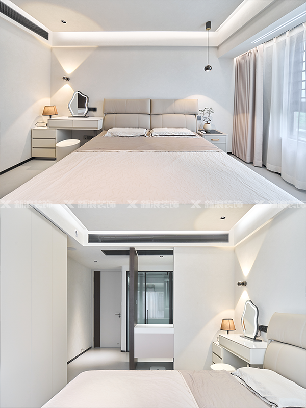 主臥床和洗手間用造型屏風+洗手臺做隔斷,梳洗+化妝一舉兩得。床位一整墻衣柜,全家被褥衣物都妥善收納!