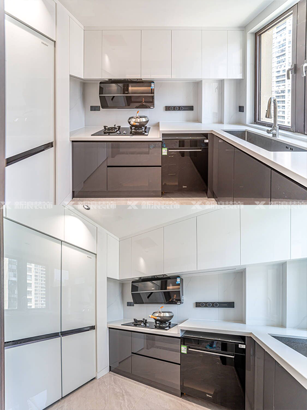 整體色調統一,用木飾面、巖板、大理石等不同材質碰撞,整體空間精致感十足