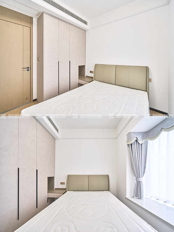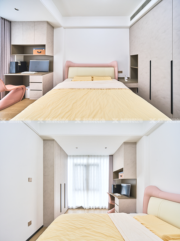 書房采用分段式無拉手設計,書房面積偏小,無拉手保證空間簡潔化。臥室采用一門到頂設計,主臥采用柜體色做柜門,一門到頂和分段式相結合,增加實用性。