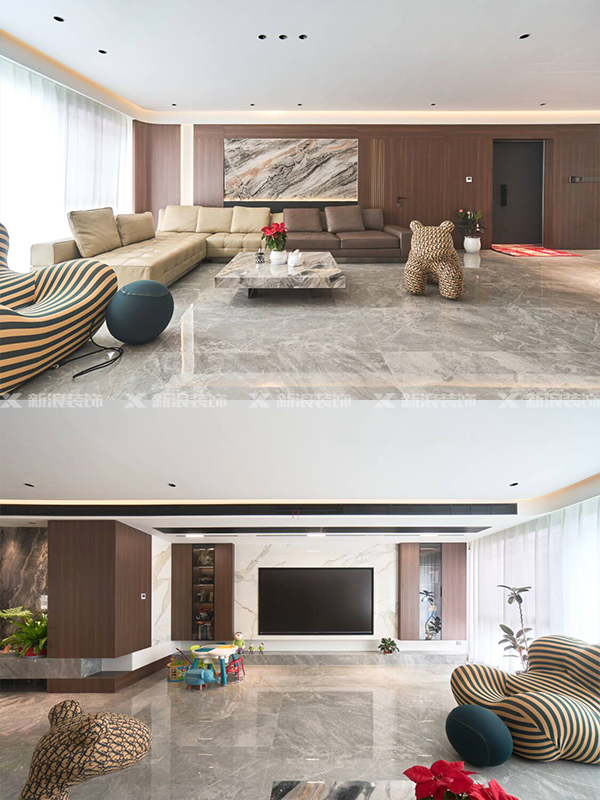 沙發背景和電視背景均采用巖板設計,進行點綴以及呼應整個空間