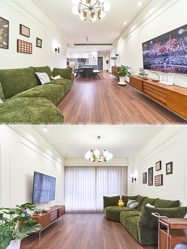 客廳墨綠色復(fù)古花瓣形沙發(fā),和餐廚區(qū)的綠色形成呼應(yīng),搭配移動小邊幾,復(fù)古背景掛畫、綠植,周末窩在沙發(fā)看看電影,獨居天堂get!