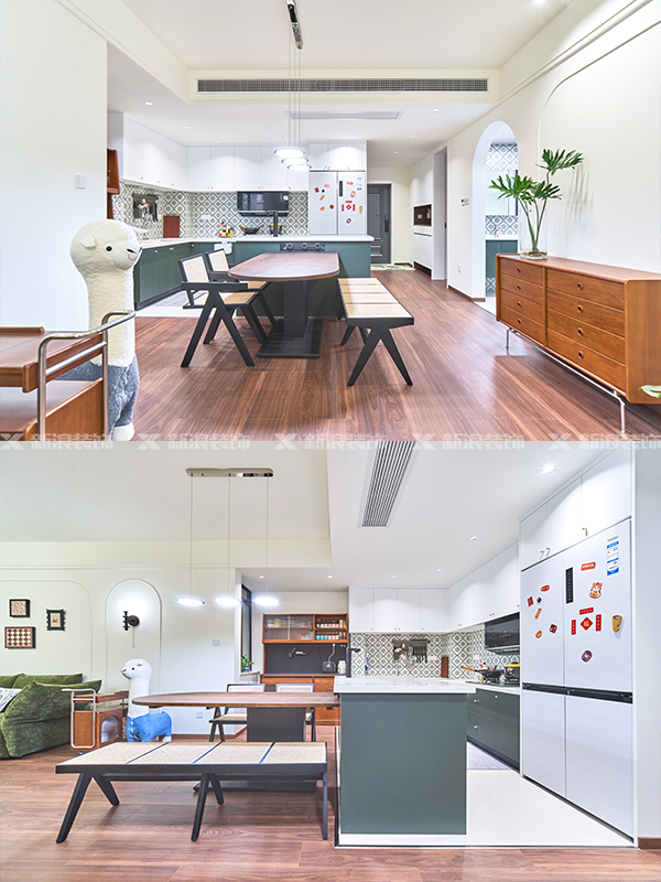 定制餐島臺靠近廚房區(qū)域作為操作臺的一個補充,使用方便。居中形成洄游動線,靠墻成品實木餐邊柜,收納超強。日常調(diào)點小酒、飲料,約三五好友淺酌,真的很愜意。
