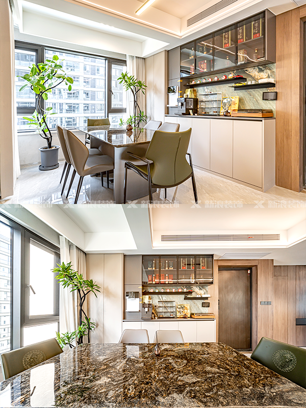 ?暗綠色奢華巖板裝飾,和餐邊柜互相呼應,打造低調的奢華視覺享受。