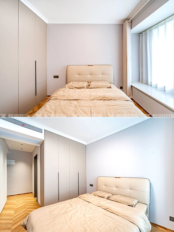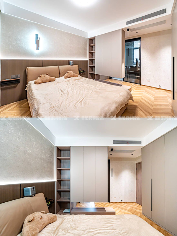 ?主臥大套間,整面墻做收納衣柜,結合半墻造型隔斷,讓空間不顯單一。