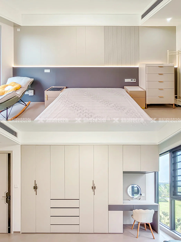 臥室做衣柜+梳妝臺一體,灰與白穿插撞色,床頭同色系背景墻相呼應,打造舒適空間。