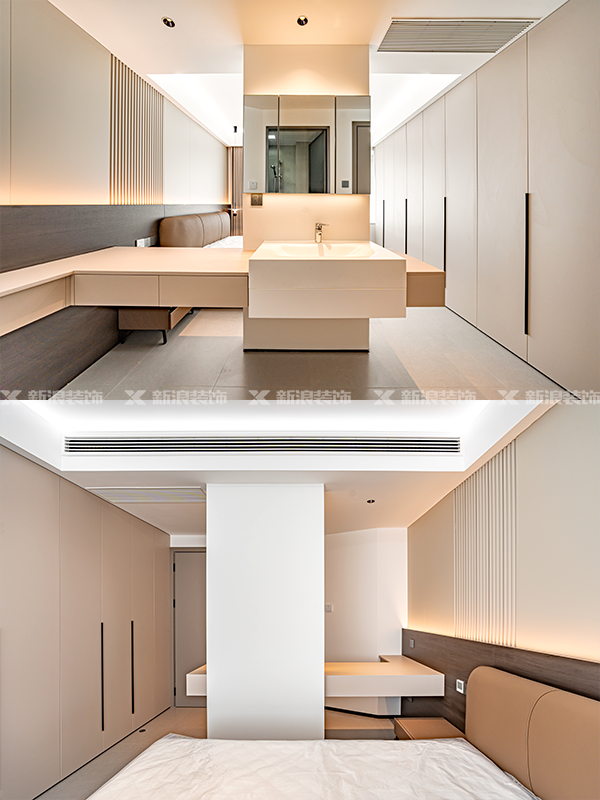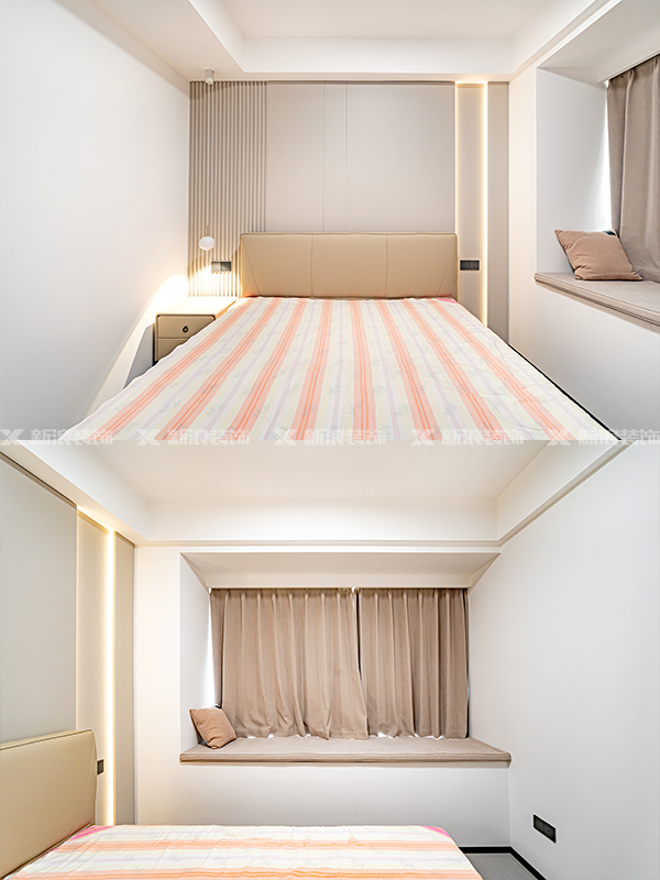 臥室床頭背景格柵+燈帶超有氛圍感。衣柜一門到頂顯品質(zhì)。