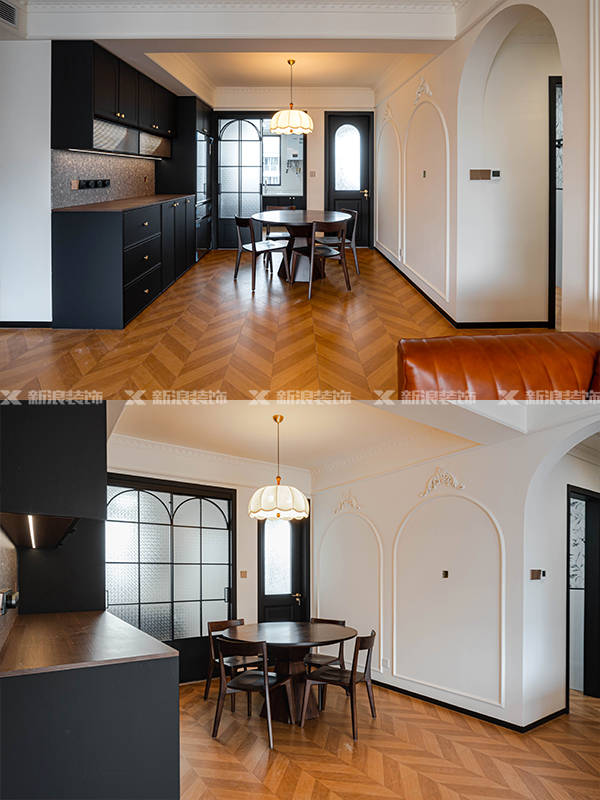 硬裝以中古風為基調,PU線條、角花、拱形門洞,華麗的雕花燈盤,魚骨紋木紋瓷磚通鋪。定制柜同色房門搭配黃銅拉手,浪漫又優雅。