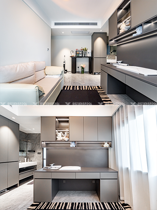 主臥做套房設(shè)計(jì),利用衣帽間做隔墻,一邊做隱藏投影,穿插式一字型梳妝臺。