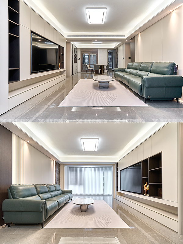 電視柜做嵌入式,收納和開放格結合。沙發背景墻格柵+威尼斯棕花色結合,簡約不失設計感~