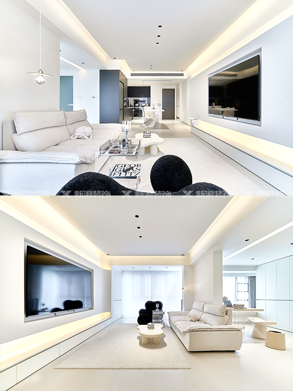 整體色調以現代黑白為主,搭配暖色燈帶和軟裝,溫馨滿滿。