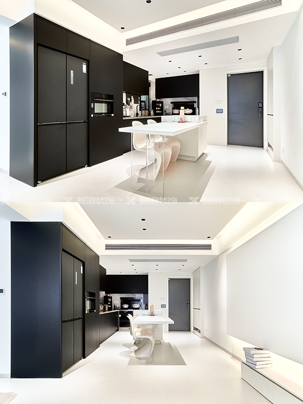 做開放式廚房,黑色櫥柜好打理。餐島臺一體,透明桌角,整體更通透。
