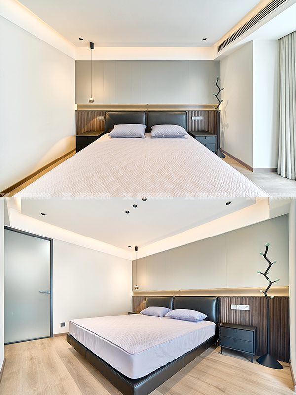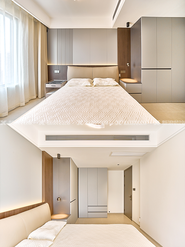全房無主燈設(shè)計(jì),點(diǎn)光源和線性燈帶提供充足照明,柔和溫馨