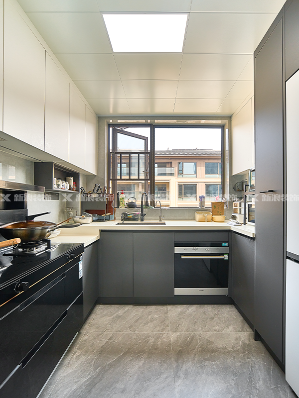 無主燈設計搭配淺灰花紋大地磚,簡潔大氣,視覺拉高層高,更顯通透。