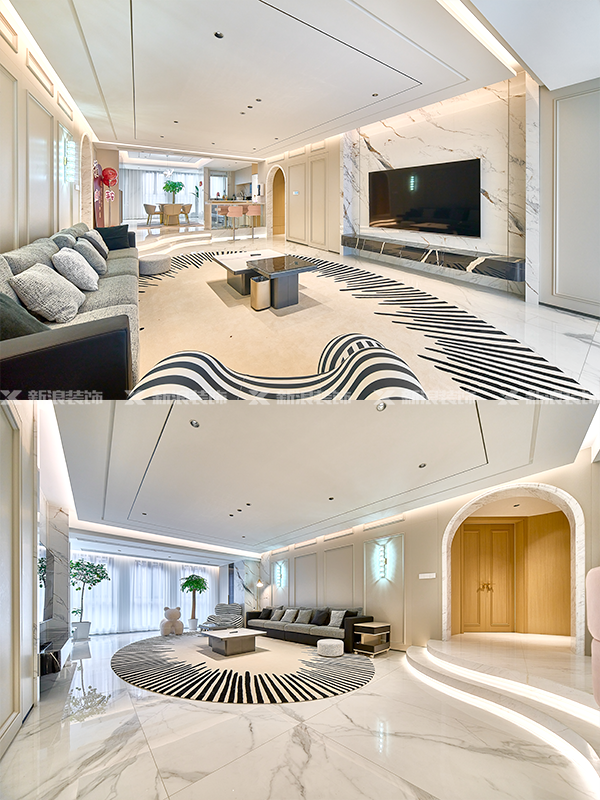 整體以簡約黑白為主,弧形吊頂延伸至陽臺將打通的空間融合進(jìn)室內(nèi),打破方盒子的平衡,創(chuàng)造了更具魅力的空間。