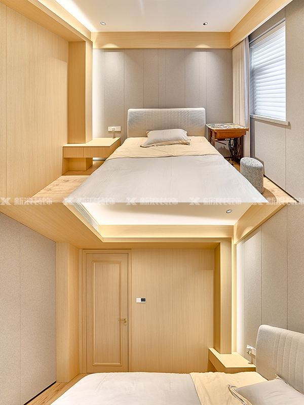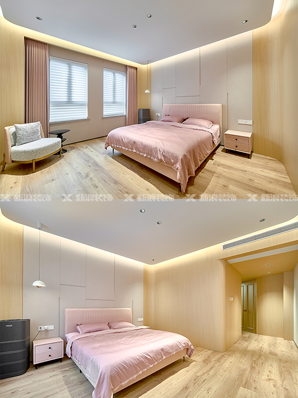 臥室軟包、木皮等材質(zhì)上墻,呈現(xiàn)出豐富的層次感,將藝術(shù)與功能轉(zhuǎn)化為精致的細(xì)節(jié),營造出靜謐舒適的休憩氛圍。陽光透過建筑灑入室內(nèi),帶來溫柔與浪漫之感。