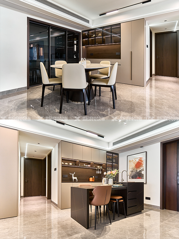 茶室、觀影、西廚餐島臺、中式圓桌餐廚區(qū),滿足一家人的互動、休閑。