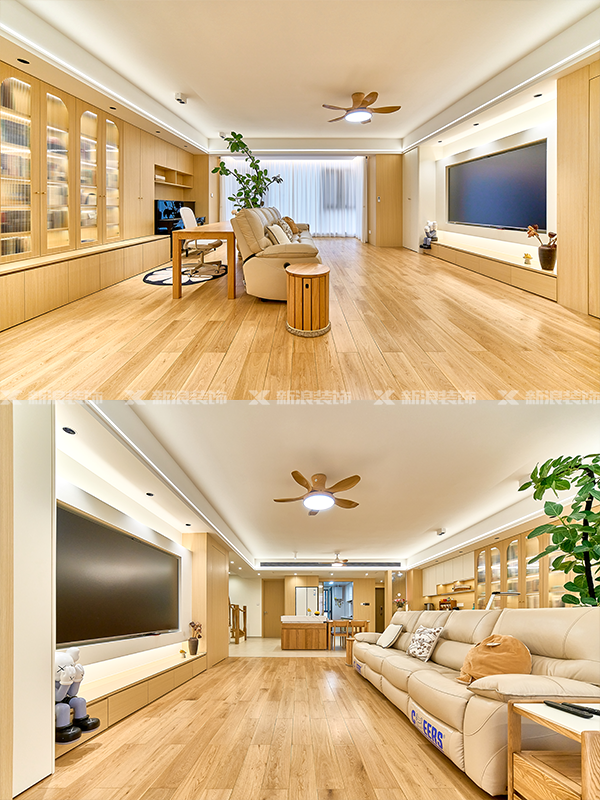 ?? 客餐廳一體大橫廳,電視背景墻留隱形門進出,簡潔大方。