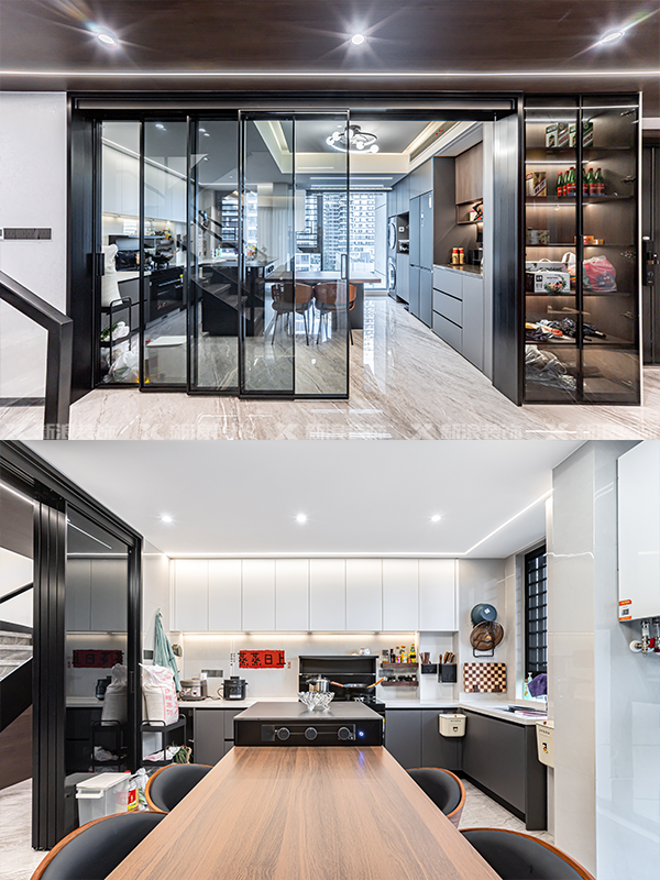 餐廚一體設(shè)計,大磚通鋪,四聯(lián)動推拉門,開閉自如。餐島臺居中,洄游動線流暢。