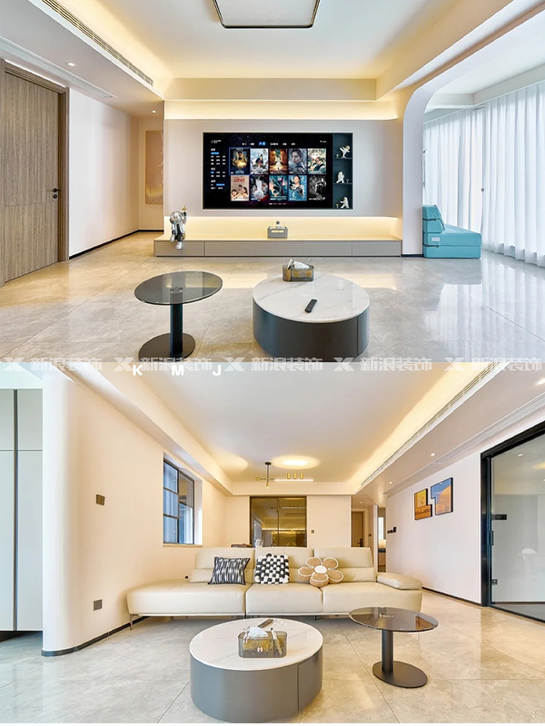 新浪裝飾,極刻美家,客廳滿墻電視柜,長沙裝修,麗爾曼頓,充滿設計感的電視柜,圓弧包柱,高端全屋定制工廠,現代輕奢裝修,精裝房設計,家居家裝日常