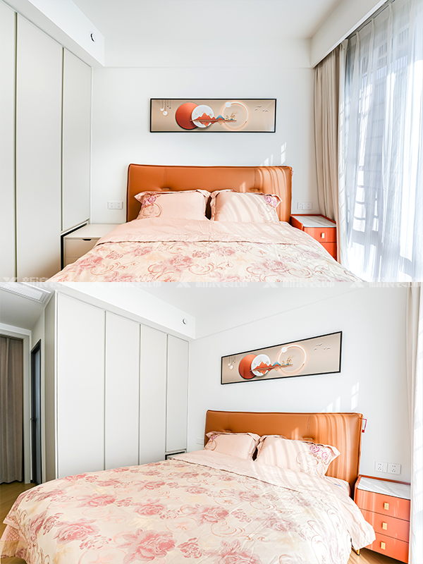 簡約摩卡棕碰撞大面積的留白,空間靈動不壓抑。搭配同色軟裝、掛畫,溫馨滿滿。