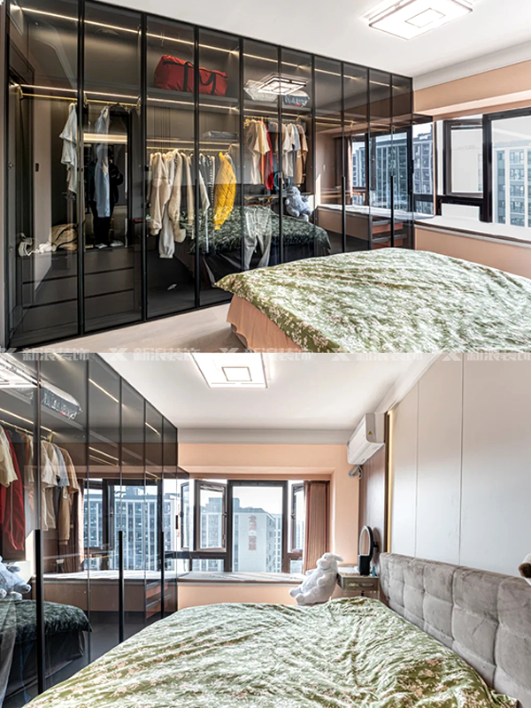 主臥拆除原吊頂增加層高,利用玻璃門擴大整體空間視覺效果。