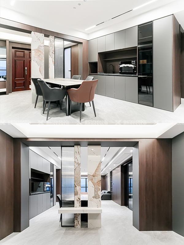 玄關處用石材和玻璃進行隔斷,打造端景。油然而生的高級感不僅解決了風水問題,又使得空間連貫,簡潔通透,一舉多得!