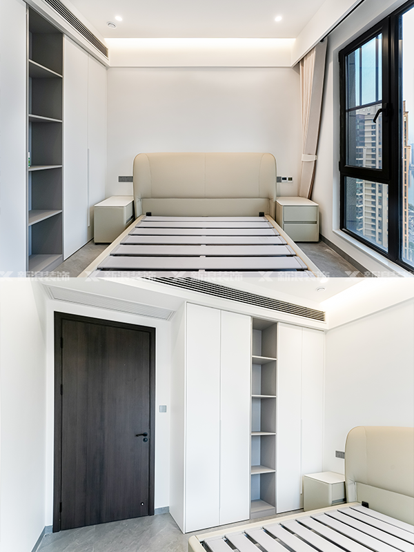 高端全屋定制:萬象天冠18mm厚杉木芯板柜體、歐松板膚感柜門、奧地利進口百隆一字鉸鏈、圓弧工藝、標配18mm背板+通體型材拉手。