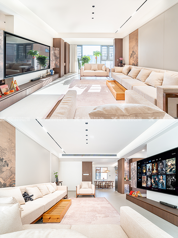 客廳無主燈吊頂,視覺上非常有整體感,電視背景墻做簡約懸浮造型,與沙發新中式風格背景相輝映。