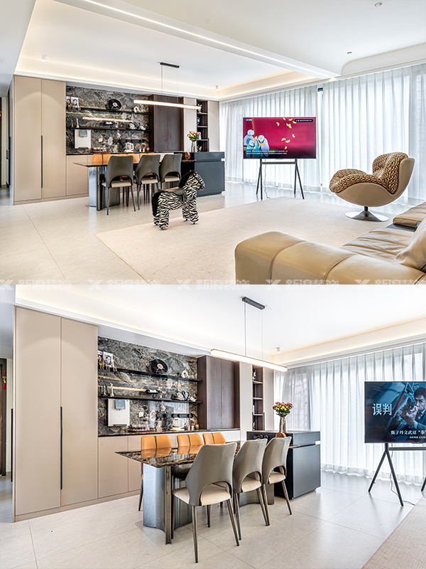 新浪裝飾,麗爾曼頓,極刻美家,餐桌導臺一體化設計,餐邊柜設計,巖板餐桌,家具好物分享,長沙全屋定制工廠,長沙靠譜裝修公司,高級感裝修,整墻餐邊柜