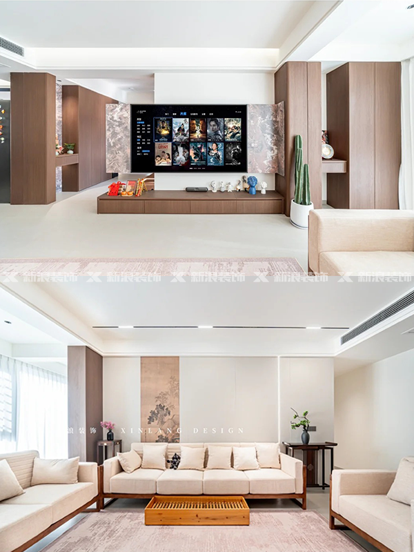 **客廳**:簡約木質(zhì)和巖板裝飾+工筆畫背景墻,古典與現(xiàn)代的完美碰撞,既保留了中式的雅致,又多了幾分時尚感。陽光透過紗簾灑進(jìn)來,整個空間都充滿了溫暖的氣息~