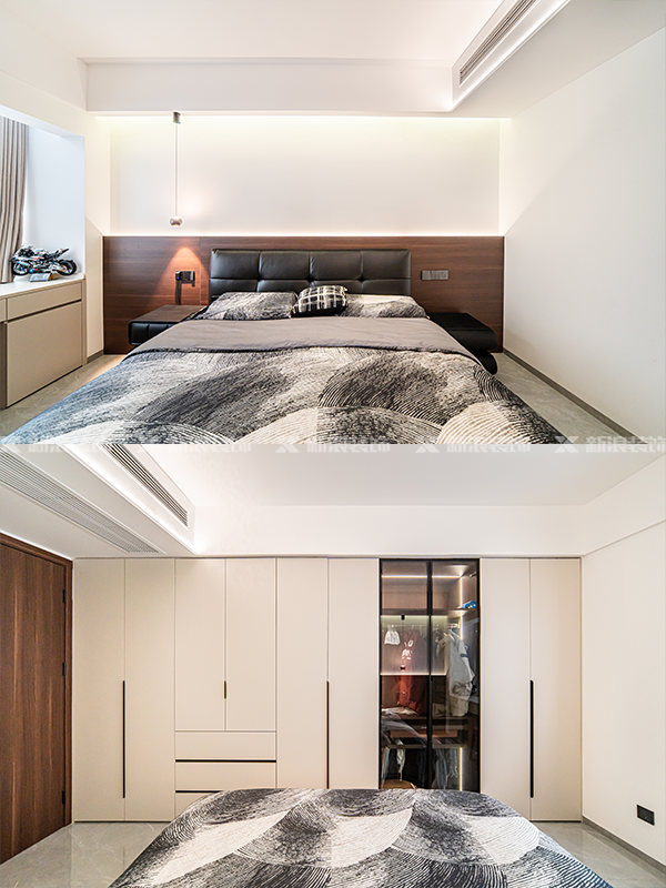 墻面通刷象牙白,大磚通鋪加上無主燈設計,營造「懸浮感+呼吸感」兼具的視覺層次。