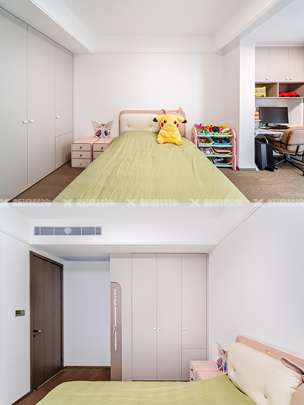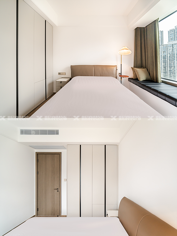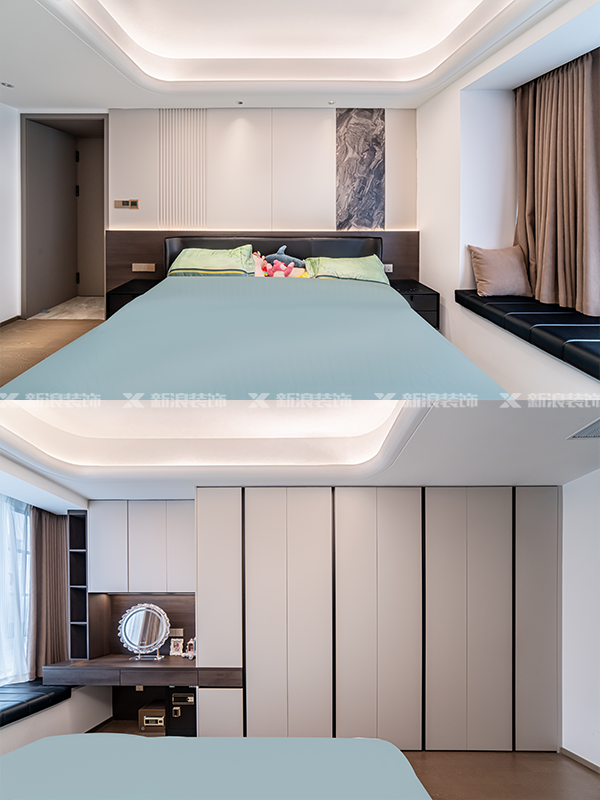 主臥做套間設計,衣帽間+床尾衣柜梳妝臺一體設計,收納空間非常充足。