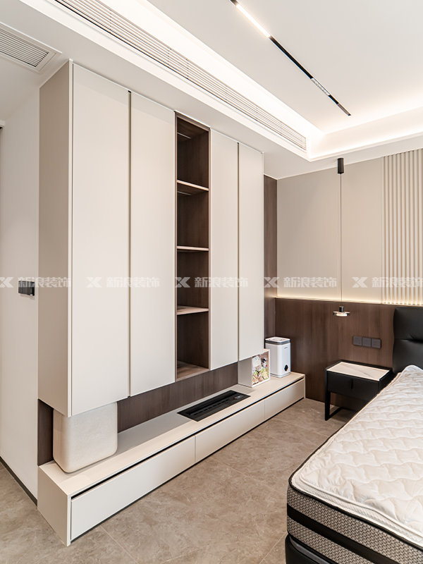 正對主臥門做L型的衣柜是男主人的一門到頂的設計加分段式的設計