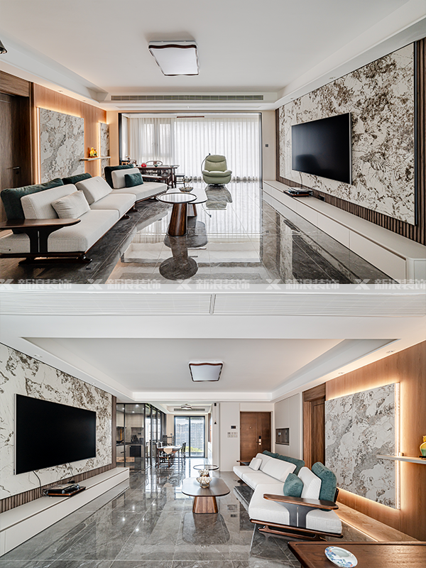 全屋定制柜體選用「摩卡棕橡+象牙灰」雙拼色,電視墻&沙發背景墻通鋪同色系巖板,搭配暖調燈帶氛圍感直接拉滿~誰說深色系不能溫柔?我家就是行走的輕奢范兒!