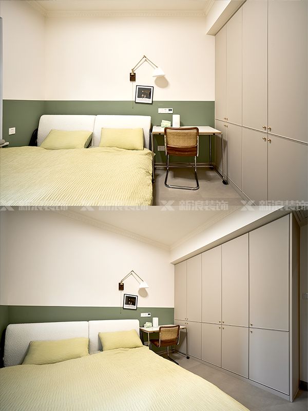 3、客廳局部做朱砂紅,搭配同色系掛畫,和家里房門以及深色家具形成呼應,空間靈動不單調。臥室分別做黃、綠色墻漆設計,彰顯個性。
